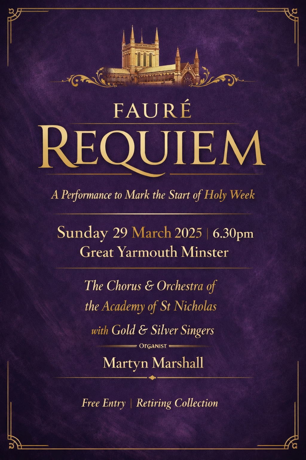 Join us at Great Yarmouth Minster on Sunday 29 March 2026 at 6.30pm for a beautiful performance of Fauré’s Requiem to mark the beginning of Holy Week.