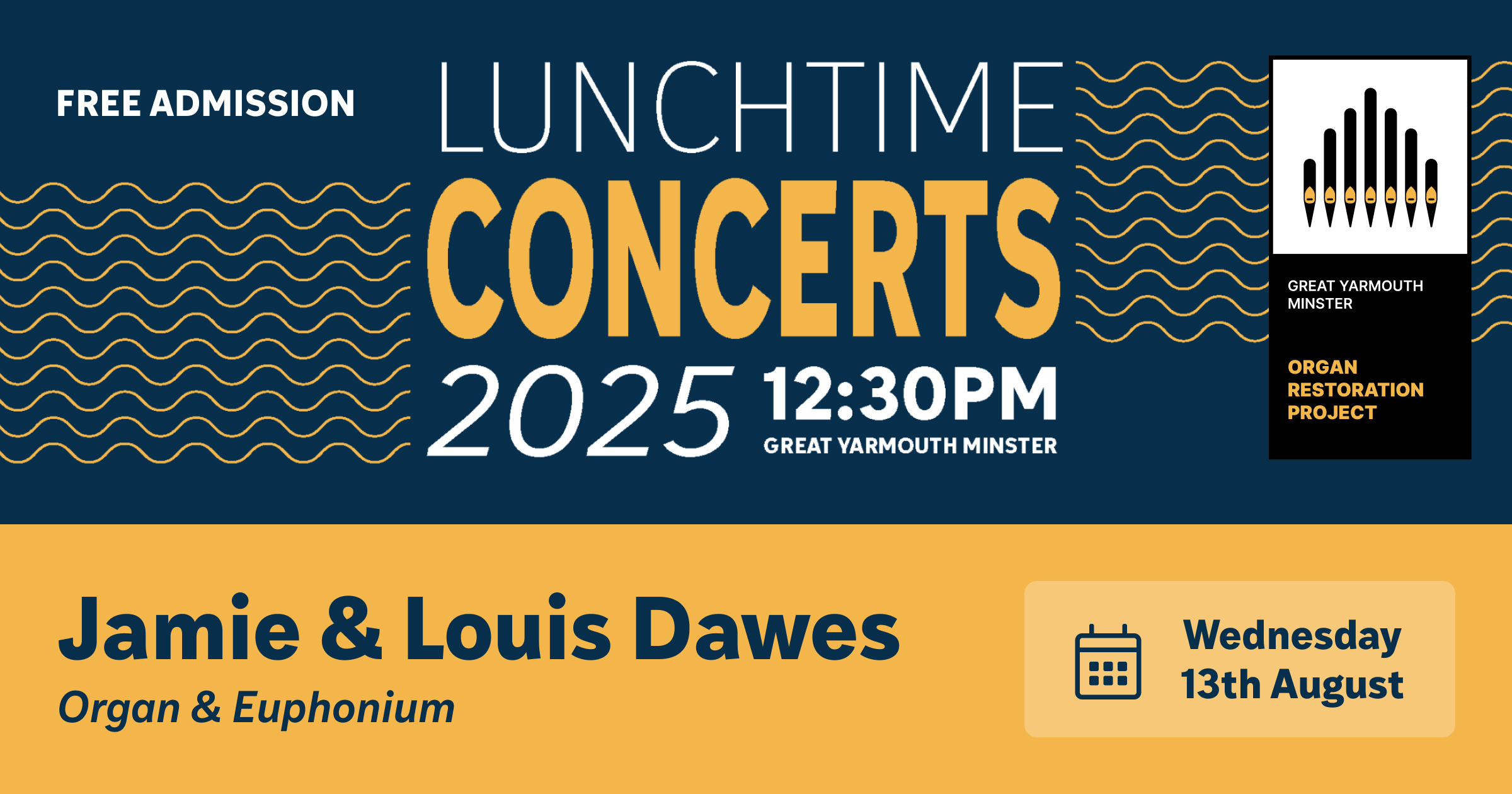 Brothers Jamie and Louis Dawes join forces for a special lunchtime concert at Great Yarmouth Minster, bringing together the grandeur of the organ and the mellow tones of the euphonium. Their programme will blend the strengths of both instruments, offering a rich and varied musical experience in the beautiful setting of the Minster.